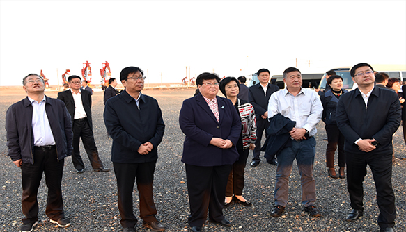 上海寶山區汪泓書記(中)、海隆集團CEO汪濤等在新疆克拉瑪依市委書記趙文泉(左二)、市長王剛(左一)、市委副書記袁罡(右一)陪同下參觀克拉瑪依紅山油田現場