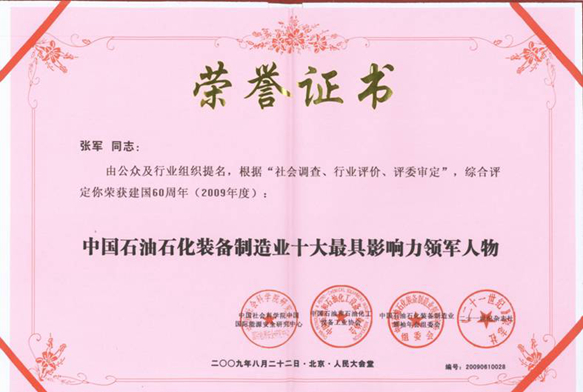 董事長張軍榮獲“2009中國石油石化裝備制造業(yè)十大最具影響力領(lǐng)軍人物”